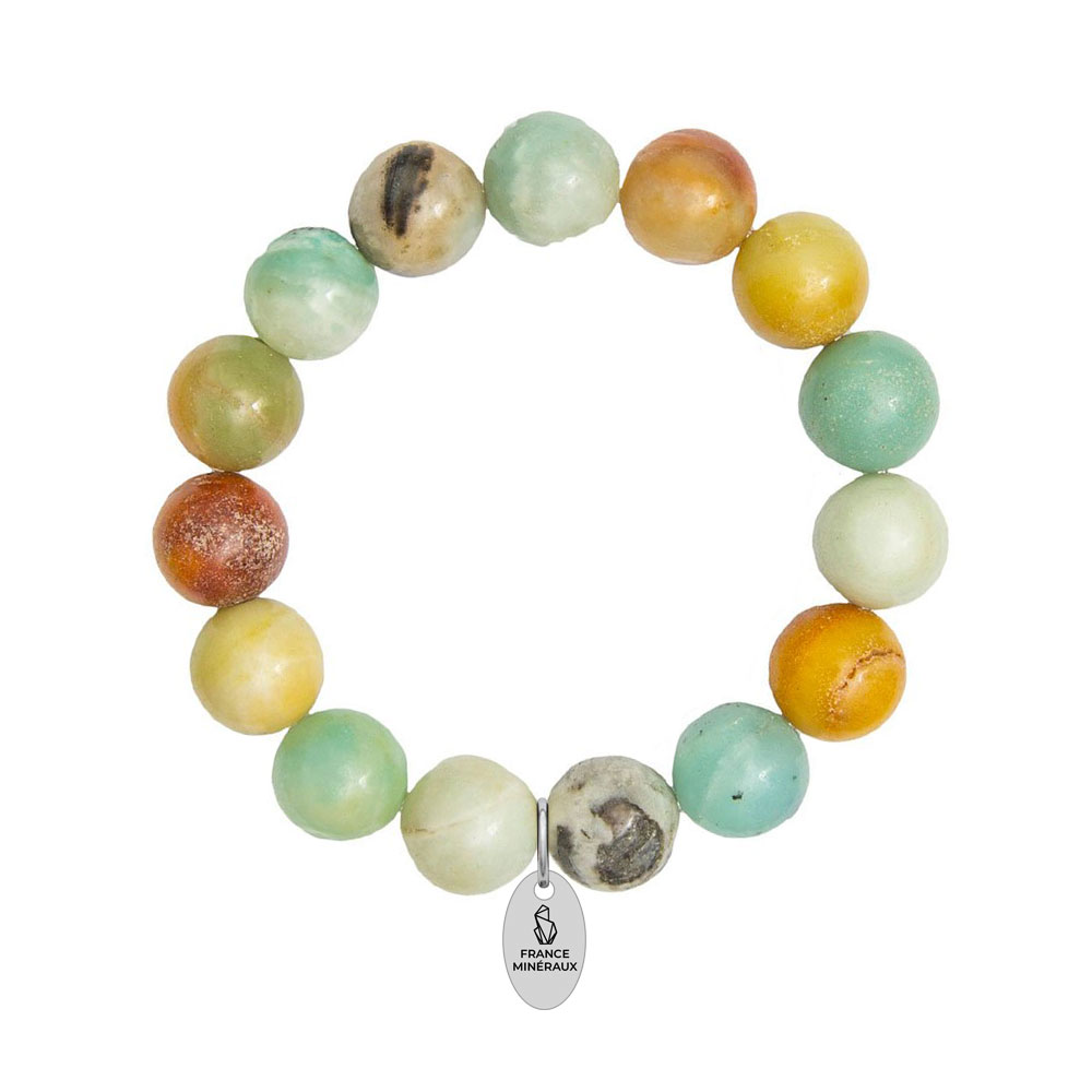 - Le bracelet amazonite multicolore en pierres boules de 12mm est un bijou aux propriétés apaisantes, créatives et communicatives. L’Amazonite apporte un sentiment de paix intérieure et d’équilibre. De plus, elle nettoie vos corps de toute négativité, de la colère ou encore de la frustration. Il stimule le courage et incite à la découverte de soi pour renforcer l’accomplissement de son être.