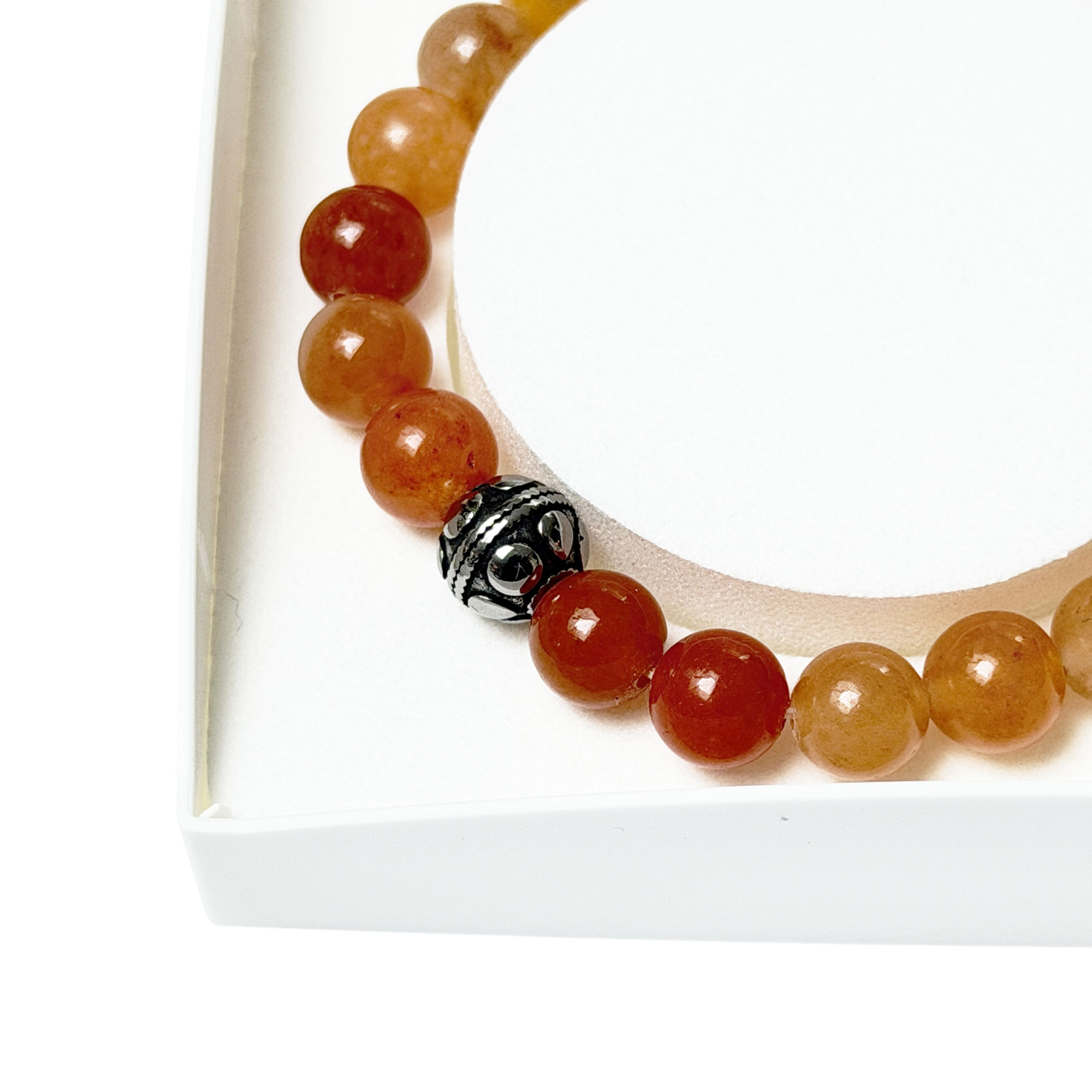 - Le bracelet aventurine orange est garant d’un certain équilibre émotionnel, canalisant la colère et le stress. Il permet également de garder le sang-froid face à différentes situations, comme par exemple les périodes de doutes, ou la prise de décisions importantes.