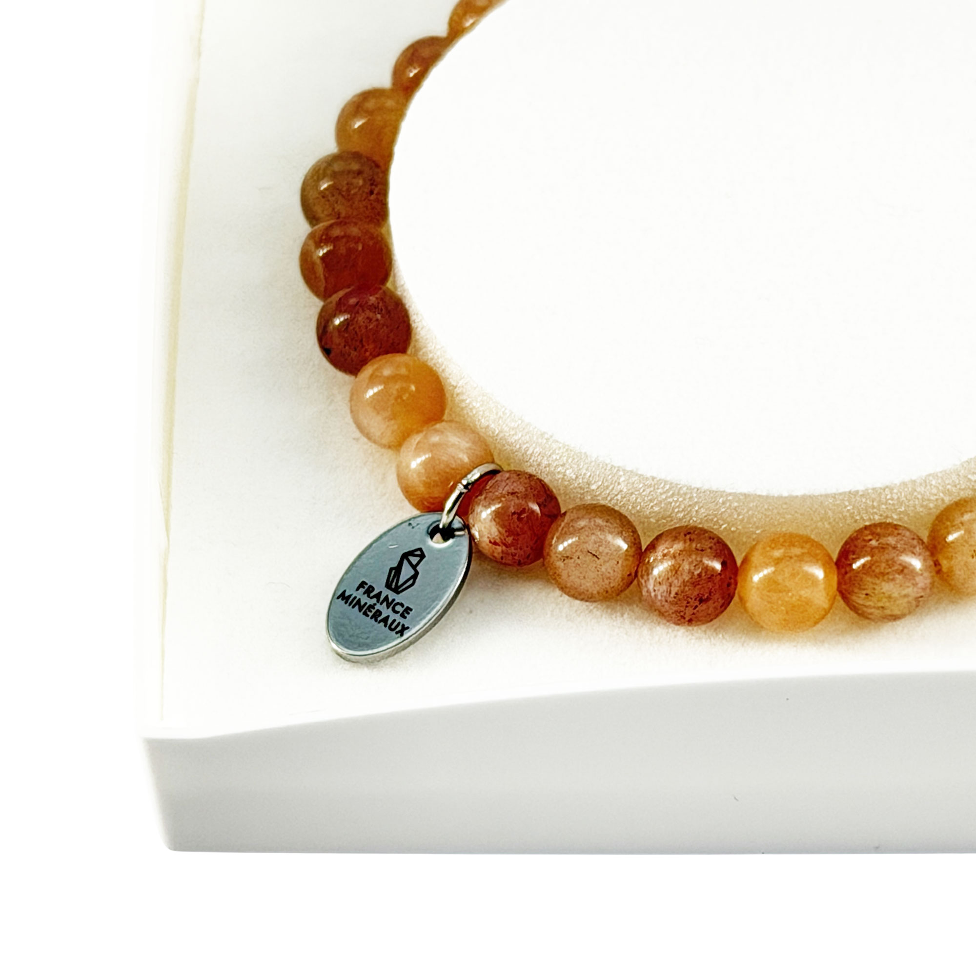 France Minéraux vous propose un bracelet héliolite en pierres boules 6mm aux couleurs chaleureuses allant du brun à l’orange. Le nom de cette pierre, communément appelée « pierre du soleil », tire son nom du grec ancien « Helios » (soleil) en référence à son scintillement rappelant celui de l’astre suprême. Lors de l’Antiquité, l’héliolite était liée au culte du Dieu du soleil, promettant joie et fortune à ses possesseurs. On lui accordait même des pouvoirs mystiques pouvant atténuer les effets des poisons dans certains cas. Les grands navigateurs des peuples nordiques emportaient quant à eux cette pierre de soleil dans leurs sépultures, la promesse de rejoindre le Valhalla. Pour les bouddhistes, elle est un signe de protection qui provient du dieu Vishnu.