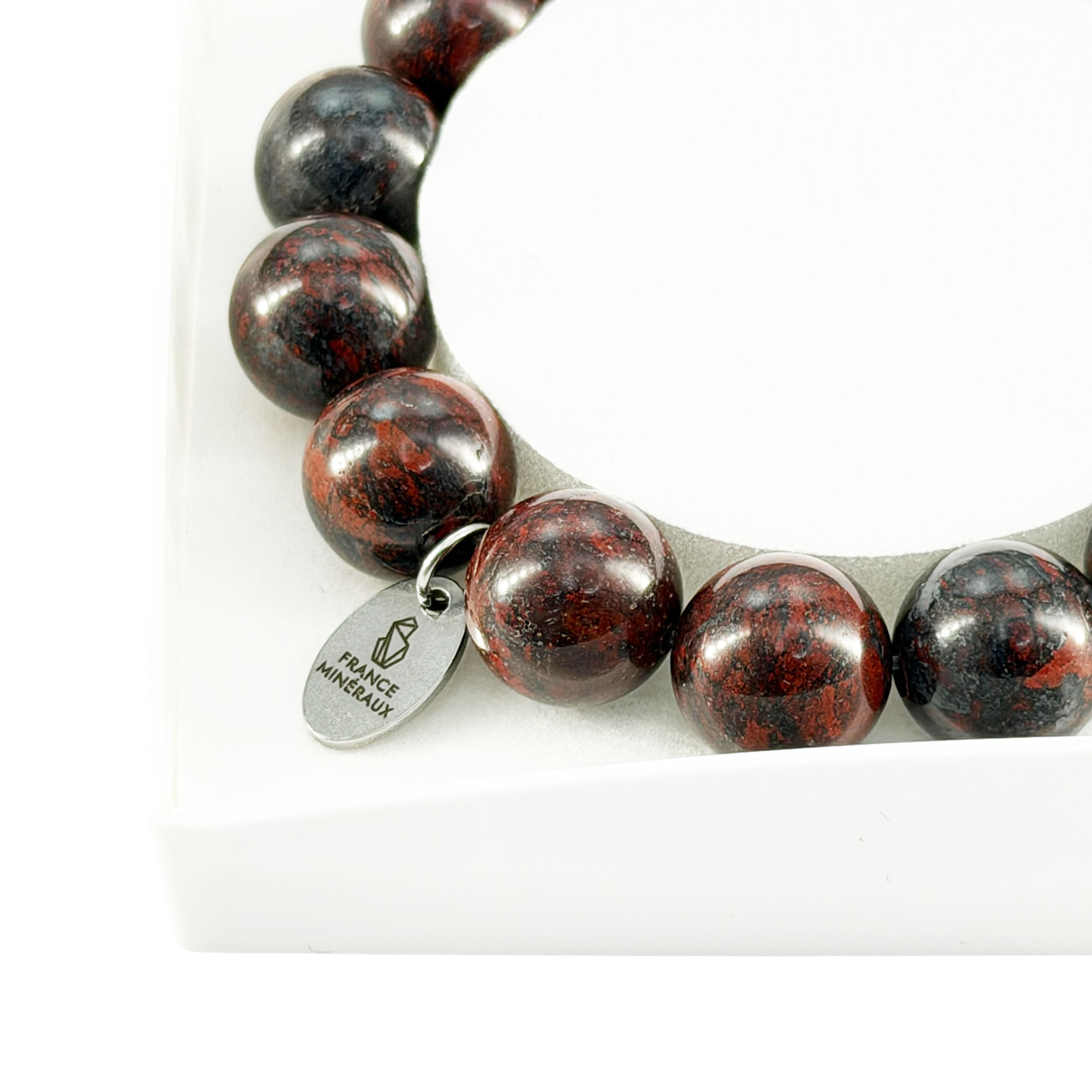 Voilà un beau bijou qui dévoile toute la palette de couleurs du jaspe bréchique. Cette pierre somptueuse exprime tout son pouvoir de protection reconnu en lithothérapie. Le bracelet jaspe bréchique en pierres boules de 12mm aligne les perles de ce minéral, également appelé « jaspe bréschia », dont les rouges intenses se superposent à de petites touches de brun ou de gris / noir.
