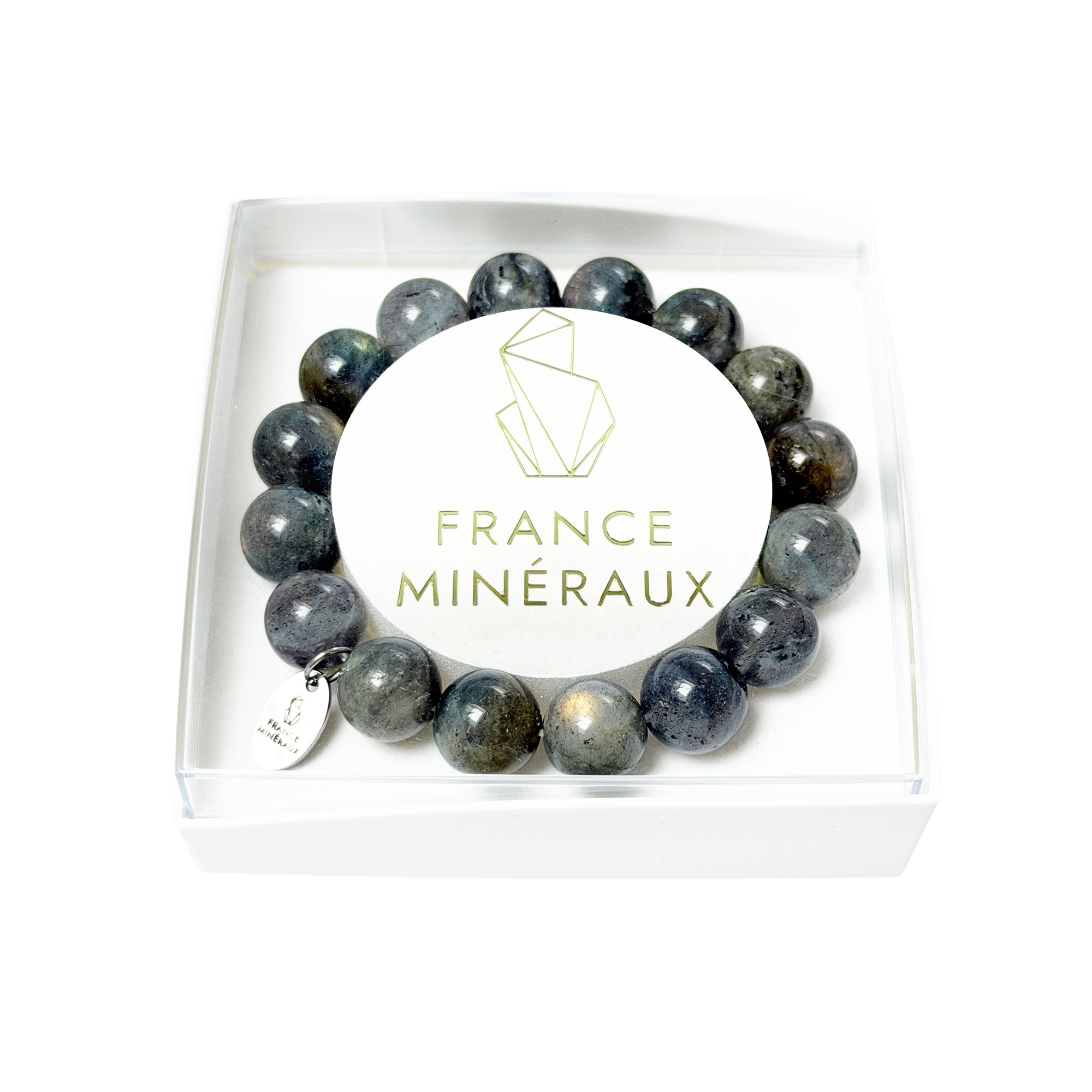 bracelet labradorite en pierres boules de 12mm. À la fois sobre et rayonnant, constitué de pierres exclusivement taillées et polies à la main, il vous transmettra immédiatement une grande élégance. Le bracelet labradorite 12mm se marie avec toutes les tenues.