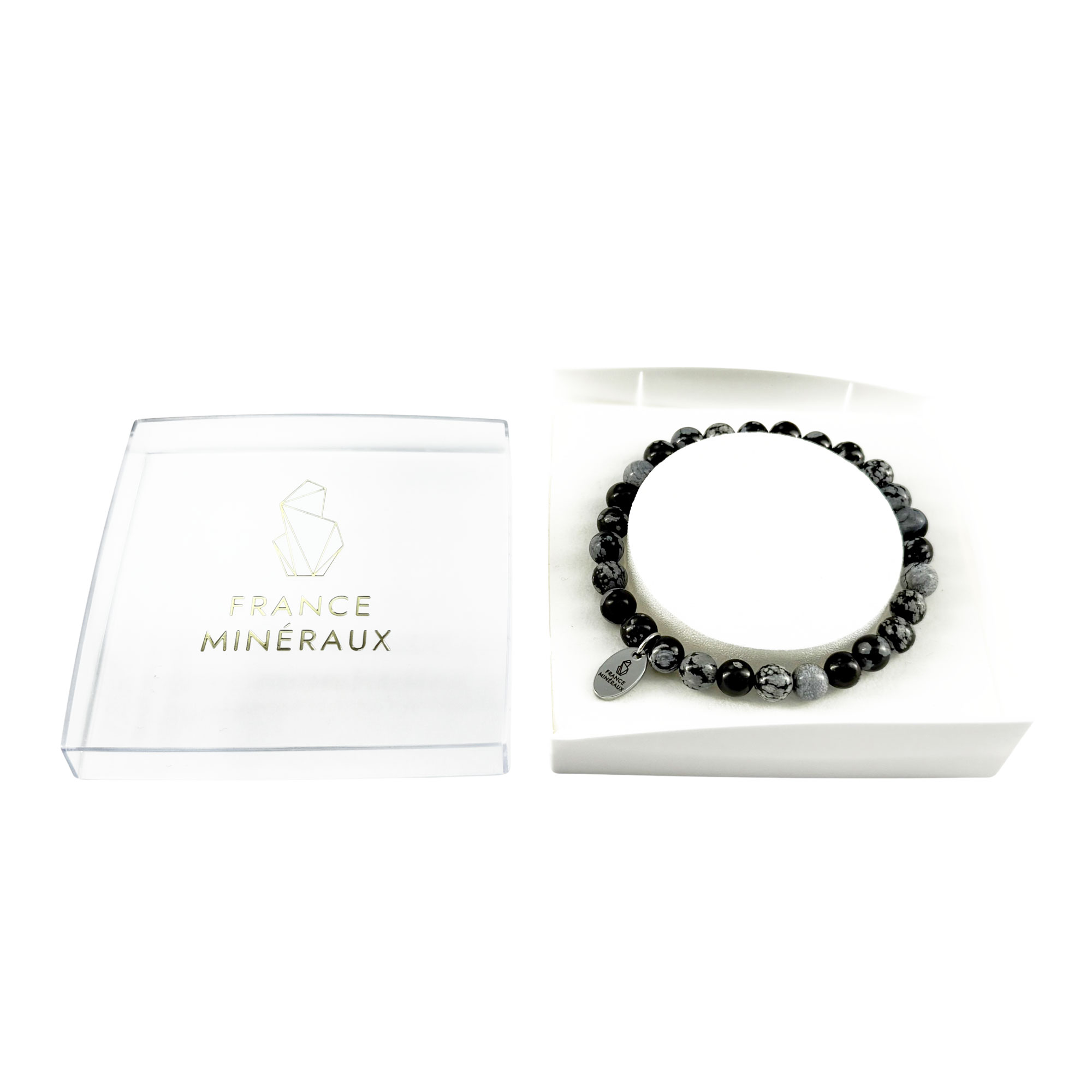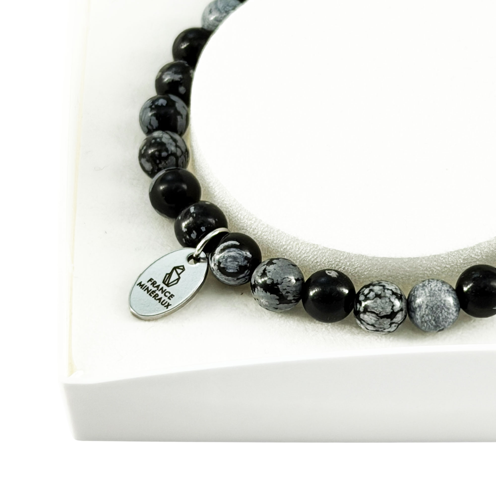 Aussi appelé “bracelet obsidienne mouchetée”, le bracelet obsidienne flocon de neige en pierres boules de 6mm se présente bien souvent de couleur noir ou gris foncé avec des tâches blanches ou grisées. France Minéraux vous le propose alors en 2 différentes tailles. Le premier bracelet mesure 18cm et compte environ 29 perles en obsidiennes flocon de neige de 6mm de diamètre. Le second bracelet mesure 20cm et compte environ 32 perles. Si toutefois vous ne trouvez pas votre bonheur parmi ces 2 tailles, n’hésitez pas à nous le faire savoir et à nous communiquer la taille souhaitée. A partir de là, nous pourrons réaliser un bracelet en obsidienne flocon de neige sur mesure et adapté à votre tour de poignet.