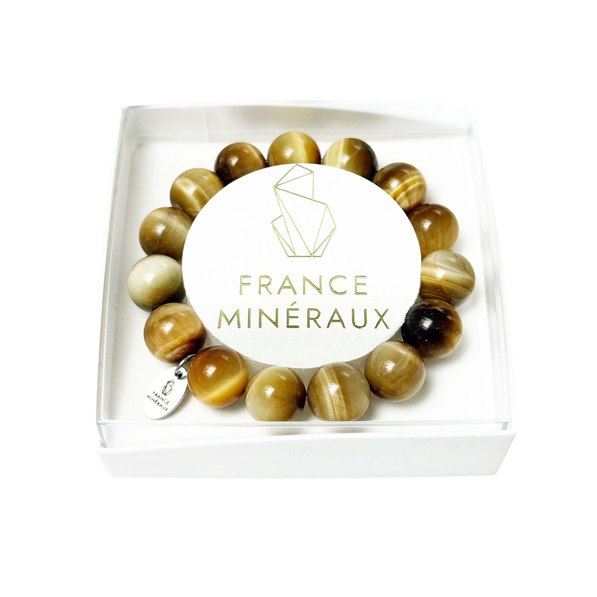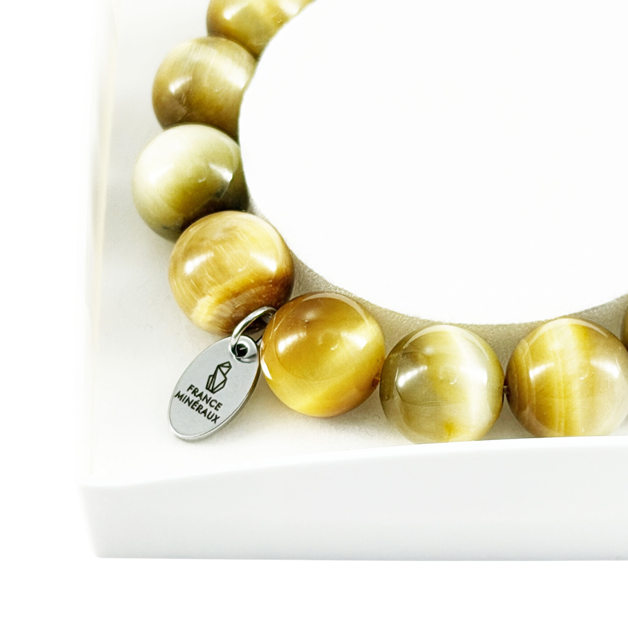 Tandis qu’on a cherché ses extraits en divers points de notre globe terrestre, le bracelet oeil de tigre doré en pierres boules de 12mm tient d’une fabrication française. Dans notre pays, ce sont des artisans émérites qui ont taillé le minéral pour former des sphères polies, pour ne plus laisser visibles aucune aspérité. La parure est caractérisée par sa douceur et des reflets lumineux. Elle sera parfaite pour quelqu’un à qui vous souhaitez les meilleurs présages.