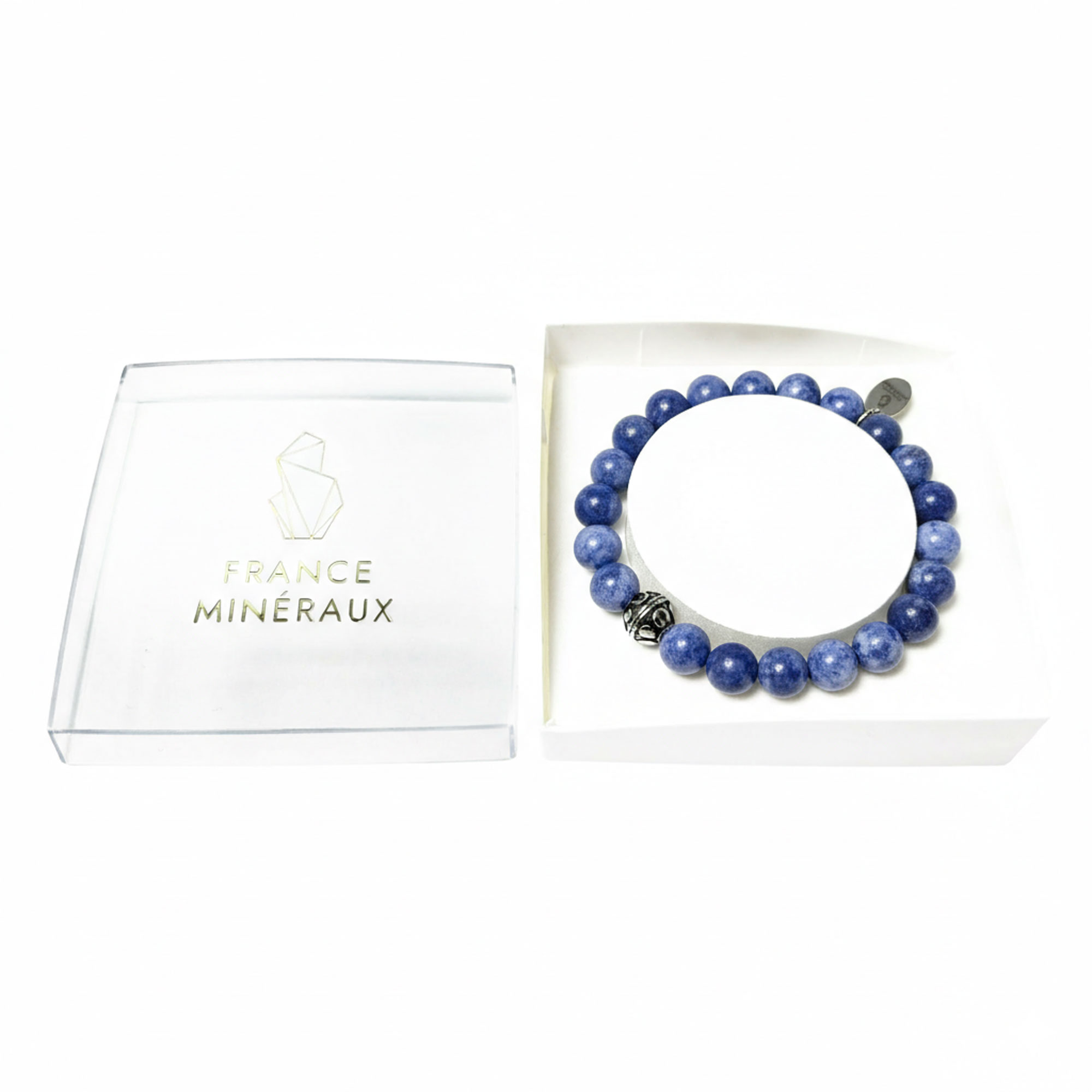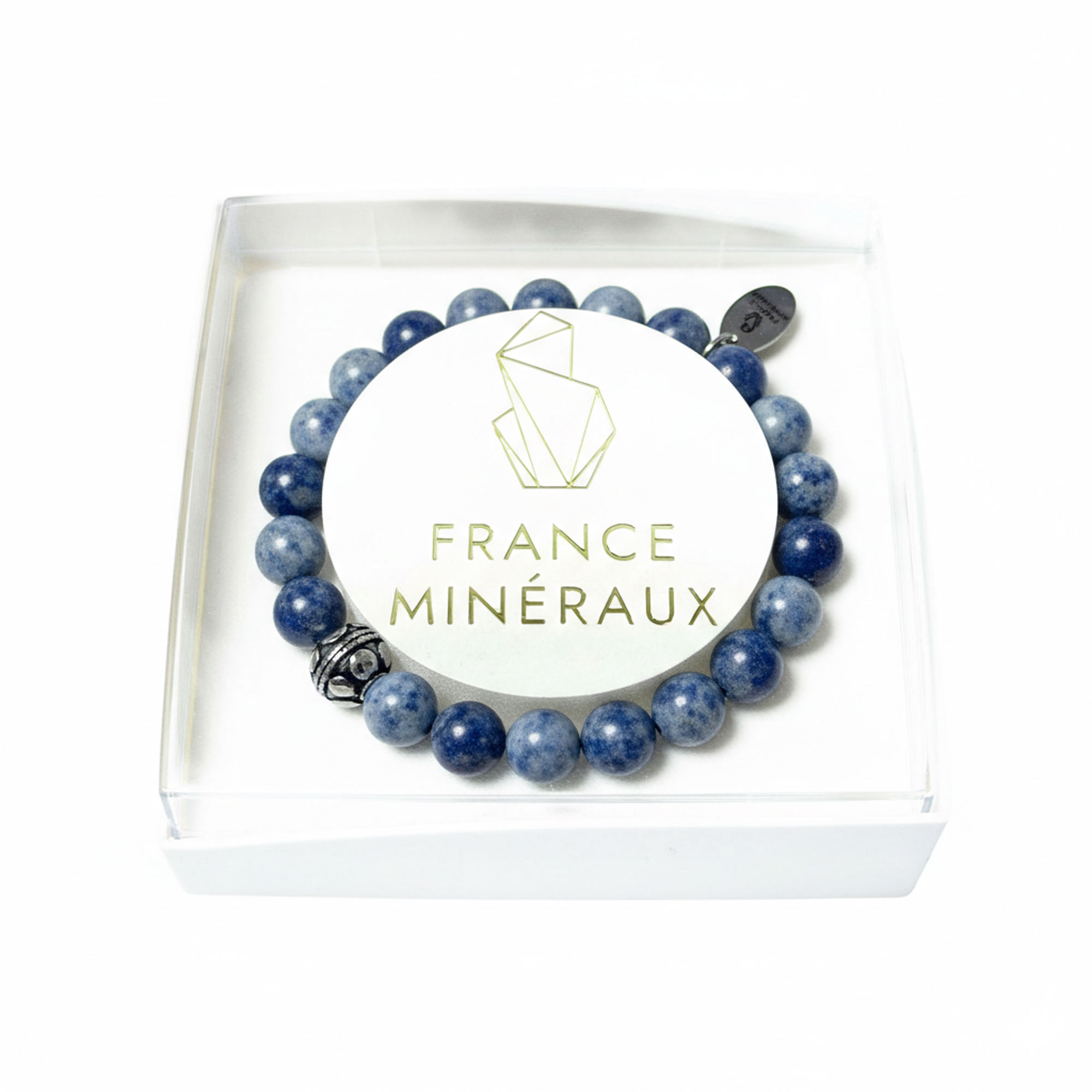 Ce bracelet en sodalite sphérique est parfait à offrir pour faire plaisir ou se faire plaisir ! La sodalite appartient au groupe des Silicates. C’est une pierre semi-précieuse composée de sodium, de chlore et d’aluminium. On trouve la pierre dans des milieux rocheux, magmatiques ou encore dans les météorites. Pierre fragile, elle est difficile à tailler. Le plus souvent, elle est de couleur bleue, variant d’un bleu clair à un bleu profond, mais elle peut aussi être blanche, rose jaune, verte ou encore rouge. La sodalite est souvent veinée de calcaire blanc. On trouve des gisements de sodalite principalement au Canada, en Afghanistan, au Groenland ou encore en Italie et en France.