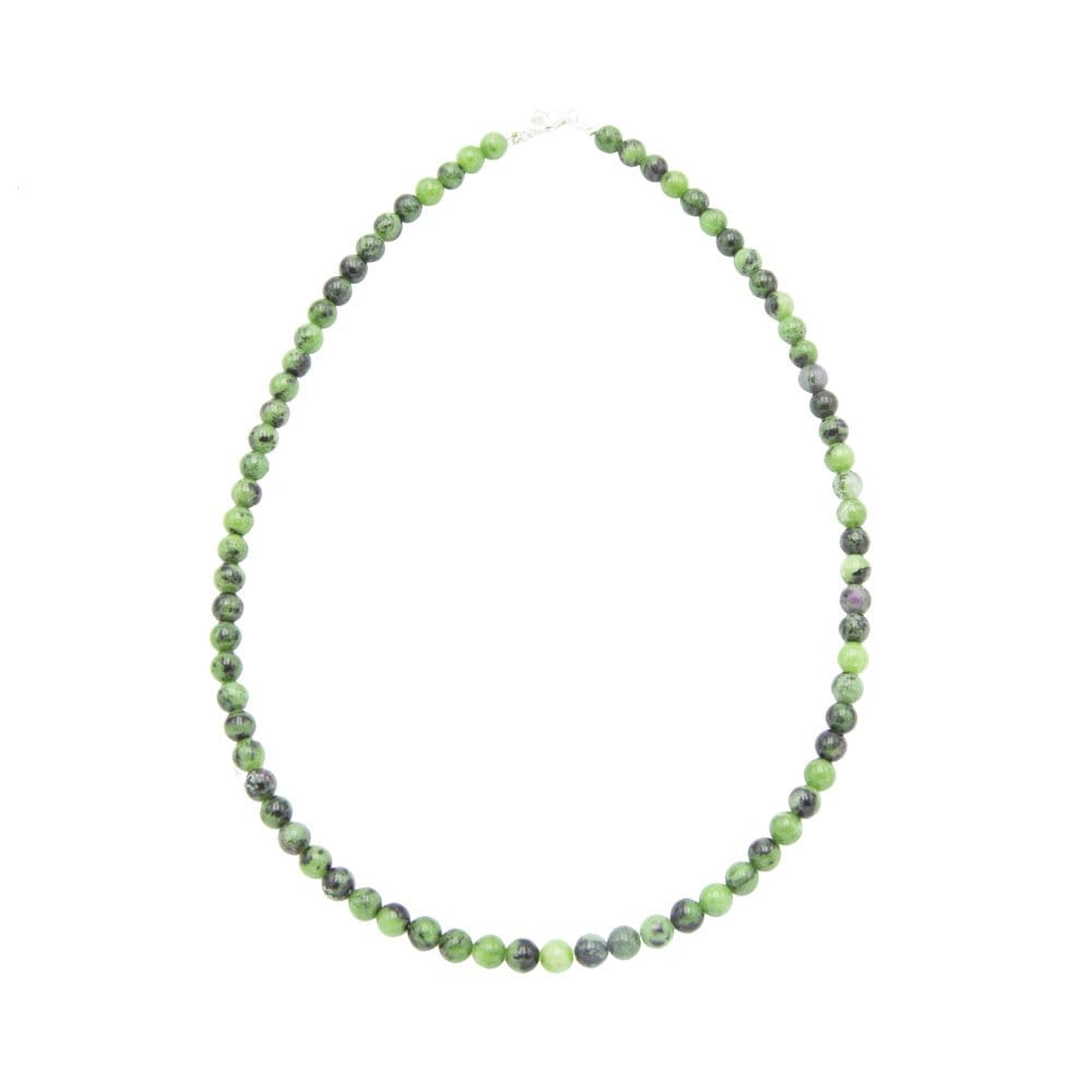 De son vert intense, constellé d’inclusions rouges, le collier rubis sur zoïsite 6mm vous est proposé par France Minéraux. Il est confectionné dans nos ateliers, en France, avec un grand soin. Nous choisissons chaque pierre au détail afin de vous garantir des produits d’une qualité optimale et d’une magnifique apparence. Les pierres boules agencées pour réaliser votre collier ont été taillées aux dimensions voulues puis polies pour arborer une surface parfaite.