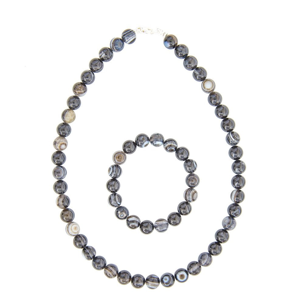 Parure composée du bracelet et du collier en agate noire zonée en pierres boules de 10mm