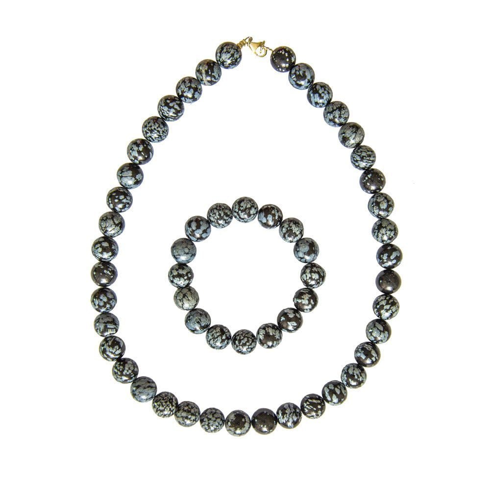 Parure composée du bracelet et du collier en obsidienne flocon de neige en pierres boules de 12mm
