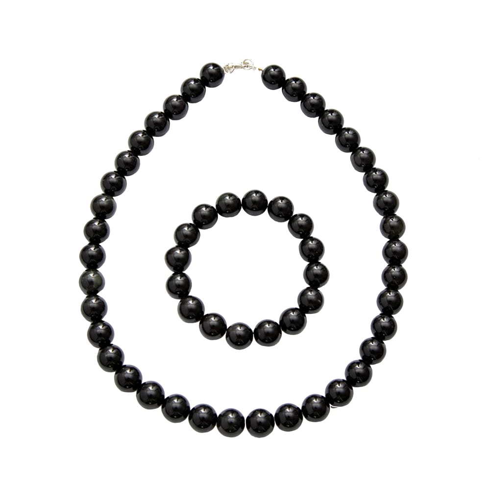 Parure composée du bracelet et du collier en obsidienne noire en pierres boules de 12mm