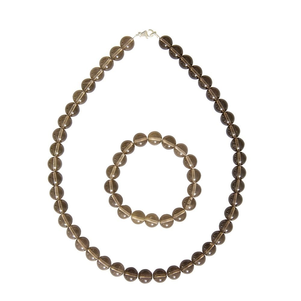 Parure composée du bracelet et du collier en quartz fumé en pierres boules de 10mm